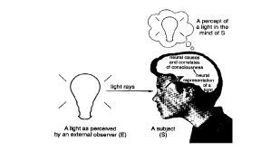 Although the private, subjective nature of conscious experience is widely thought to preclude its scientific investigation. I will argue that this is not where the real problems lie. Rather, the epistemological problems posed by the study of subjective experience are largely artefactual, arising from a misconceived, dualist, splitting of the world which we have inherited from Descartes. This implicit dualism is clearly shown in the model of perception shown in Figure 1. In fact there are two splits in this model: (1) the observer (on the right of the diagram is clearly separate from the observed (the light on the left of the diagram) and (2) public, objective “physical phenomena” in the external world or in the brain (in the lower part of the diagram) are clearly separated from private, subjective psychological phenomena “in the mind” (represented by the cloud in the upper part of the diagram).
